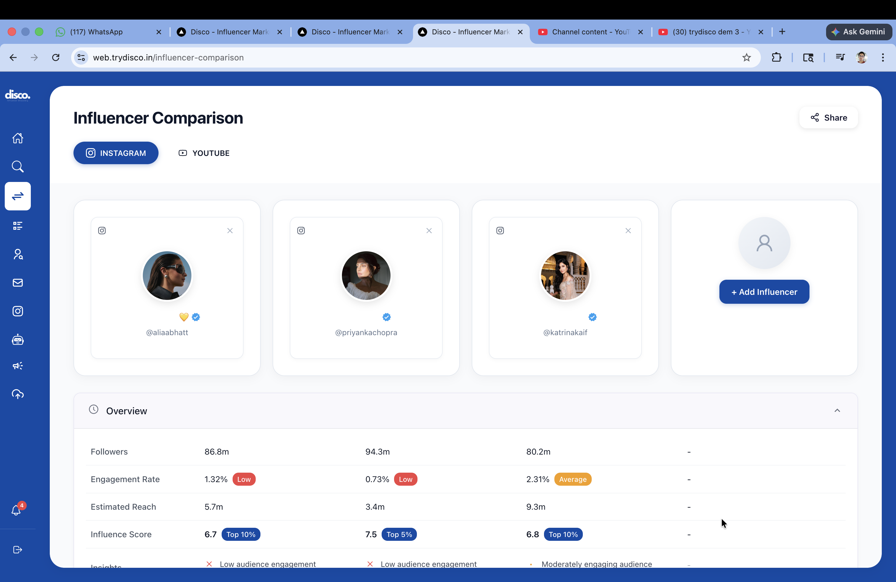 - Compare up to 5 creators simultaneously across engagement, audience quality, and growth.